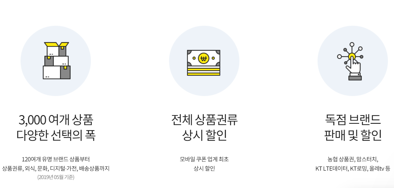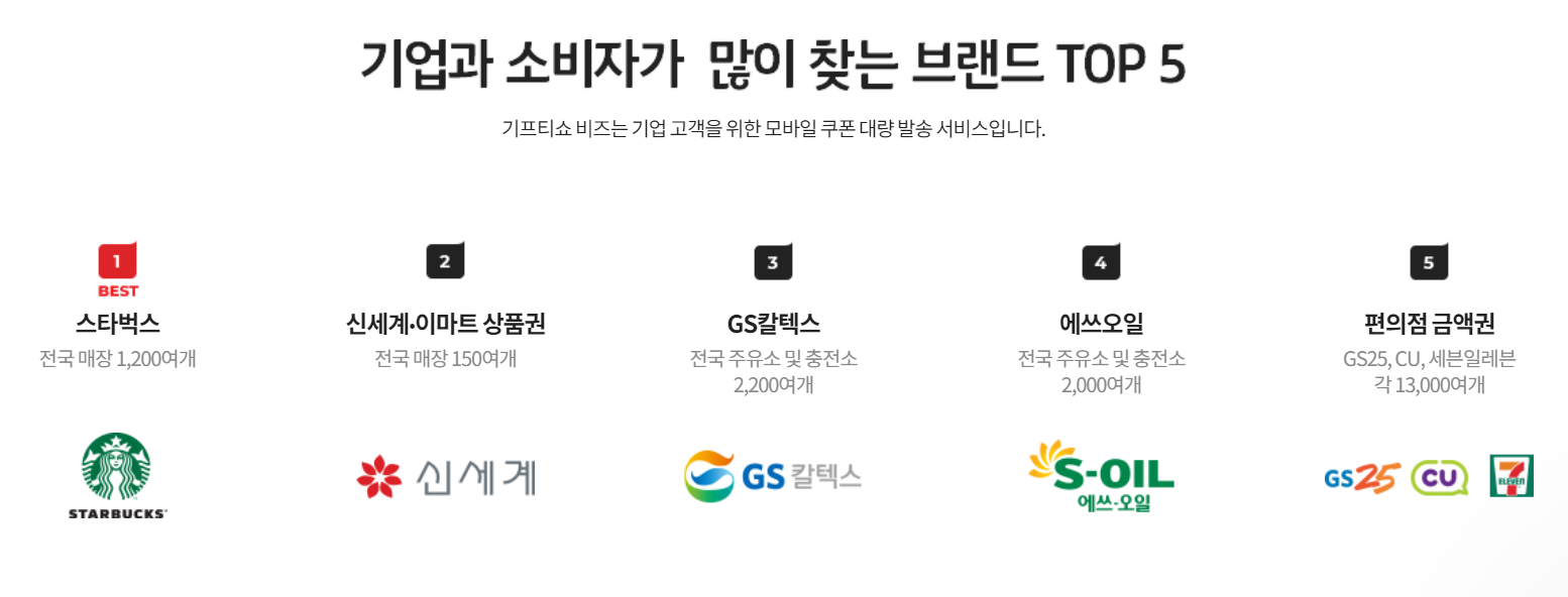 또한 기프티쇼 비즈에서만 판매하는 농협 상품권, 맘스터치, KT LTE데이터, KT로밍, 올레 tv 등의 독점 브랜드들도 있다고 합니다. :)