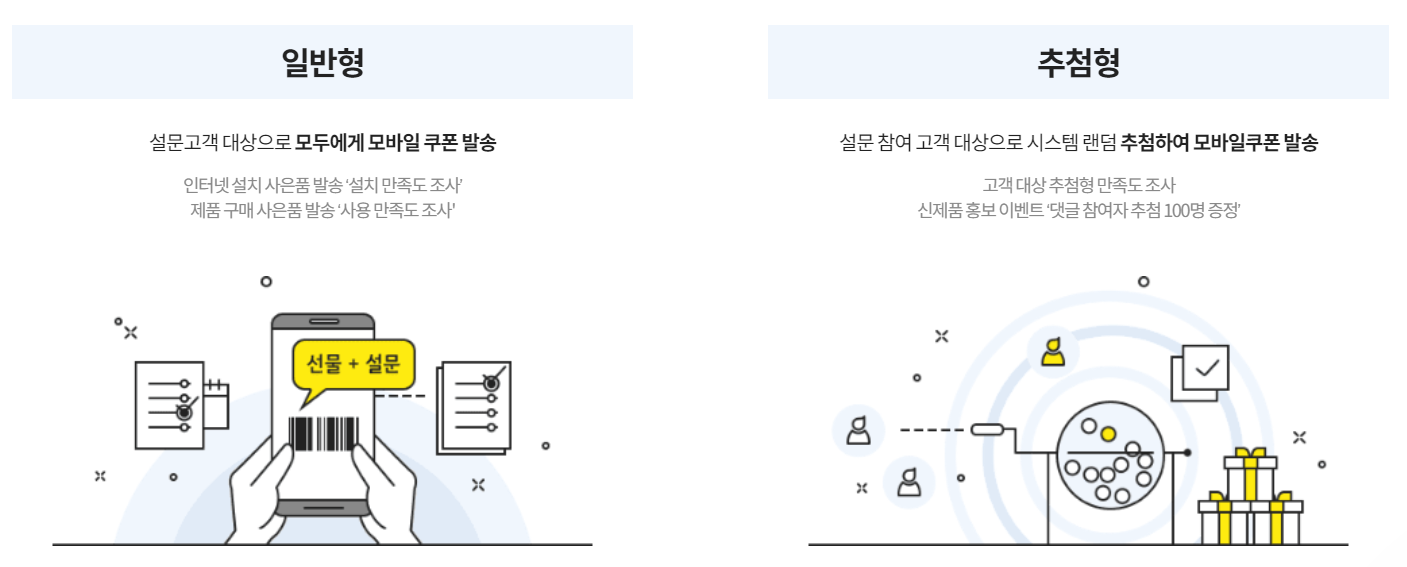 일반형은 설문고객 대상으로 모두에게 모바일 쿠폰이 발송되는 것이고, 추첨형은 설문 참여 고객 대상으로 랜덤 추첨하여 모바일 쿠폰을 발송하는 시스템입니다.